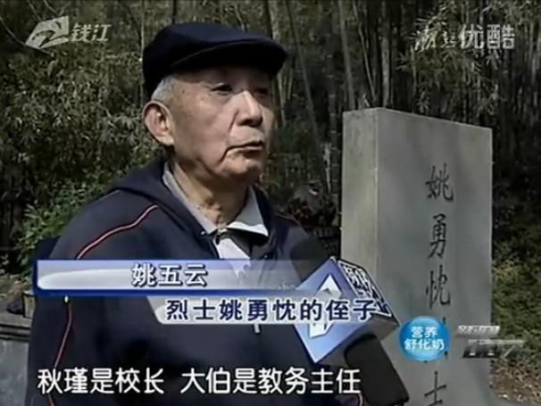 同期:烈士姚勇忱的侄子 姚五云:在绍兴大通学校的时候 秋瑾是校长,大伯是教务主任 (学校)里面是管经济的。