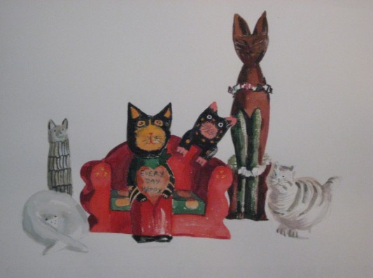 吴永杭以前养过一只白色波斯猫,在2006年春节期间走丢了,之后又收养过流浪猫。2007年、2008年他受国家留学基金管理委员会派遣到英国做公派访问学者期间,把猫转送给朋友喂养了,但他对猫的喜爱程度却一直没有减少。回国以后,他开始了从真猫抚养到收集各式猫玩具的转换。近年来,他收藏了世界各地各种材质、各样款式的猫玩具与猫摆设。第一只玩具“圈圈猫”是他在威尔士儿童玩具商店的橱窗里看见的,一见钟情;收藏的最具乡土气息的“瓦猫” 是在丽江买的,水泥材质,是滇藏高原人家屋顶镇宅用的,家家户户讨个吉利,与西北地区的貔貅一样,都是图个好彩头;“沙发猫”是朋友送他的生日礼物,一只正襟危坐,一只俏皮撒娇;“划船猫”是丽江古镇玩具店老板的处理品,却是构成《猫家族》的主要演员;“猫族长”是在英国西南部度假胜地萨莫赛特一家泰国木工艺品店淘来的;“非洲猫”是在杭州中山中路非洲艺术品展销会上淘来的……一只猫就有一个故事,吴永杭将这些收藏品进行了再创作,于是,诞生了《猫家族》系列水彩作品。这些作品打破了东西文化的藩篱,充满灵性,“猫家族” 每个成员浑圆朴拙的造型逗人喜爱,看了令人会心一笑;“猫家族”成员之间体现着和美纯真的真情,看了令人倾心向往。