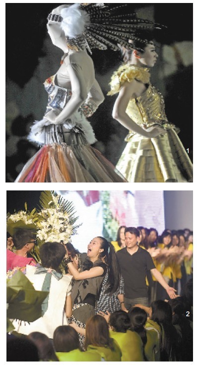 19日晚,浙江理工大学服装设计专业学生举办了“时装·剪子·布”毕业秀,贯穿“城市程式”、“释世而非”、“生态忆念”等篇章的服装表演(见图1),让观众目不暇接,但真正的高潮出现在尾声,当默默奉献在幕后的老师们羞涩地走到台前时,2010届毕业生捧着鲜花排着长队,争着和恩师拥抱,现场百余名毕业生集体为自己的老师送上感谢的掌声(见图2)。本报记者 杨晓轩 摄