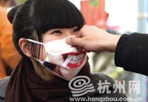 昨天下午,杭州青少年活动中心广场有个创意集市,一些年轻人在卖自己的创意产品。一个女孩子在推销口罩,她指指自己戴着的口罩说:“上面印的就是我的嘴巴。”