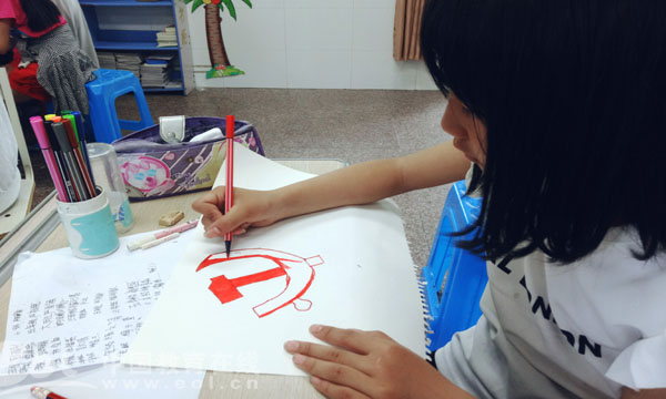 最后党徽的绘画更是将孩子们的热情推行了高潮。党徽图案被实践团成员展示在多媒体屏幕上,在讲解了镰刀锤子的内涵后,孩子们开始一个个坐在位置上专注细心地绘画。虽然孩子们略显稚嫩的笔迹画不出百分百标准的作品,但是这些专注的面孔,肯定将成为党和祖国的栋梁。