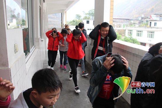 鲤鱼浩小学《开学第一课》举行安全教育。图为学生进行安全演练。浙江理工大学研支团 供图