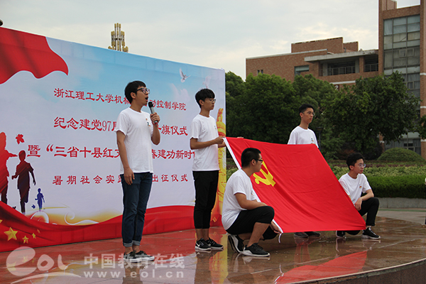 中国教育在线浙江站讯(编辑 夏晓瑜 通讯员 王淯霄)2018年7月1日是党的97岁生日。清晨,浙江理工大学机械与自动控制学院的党员们在学校世纪广场举行了庄严的升旗仪式。本次升旗仪式的主题是庆祝建党97周年,同时也是学院“三省十县红文化?青春建功新时代”暑期社会实践团的出征仪式。参加仪式的有学院党委副书记苏丽辉,团委书记、学工班主任方水明,各年级辅导员,新发展党员、学生党员代表以及暑期社会实践团代表。仪式由方水明主持。