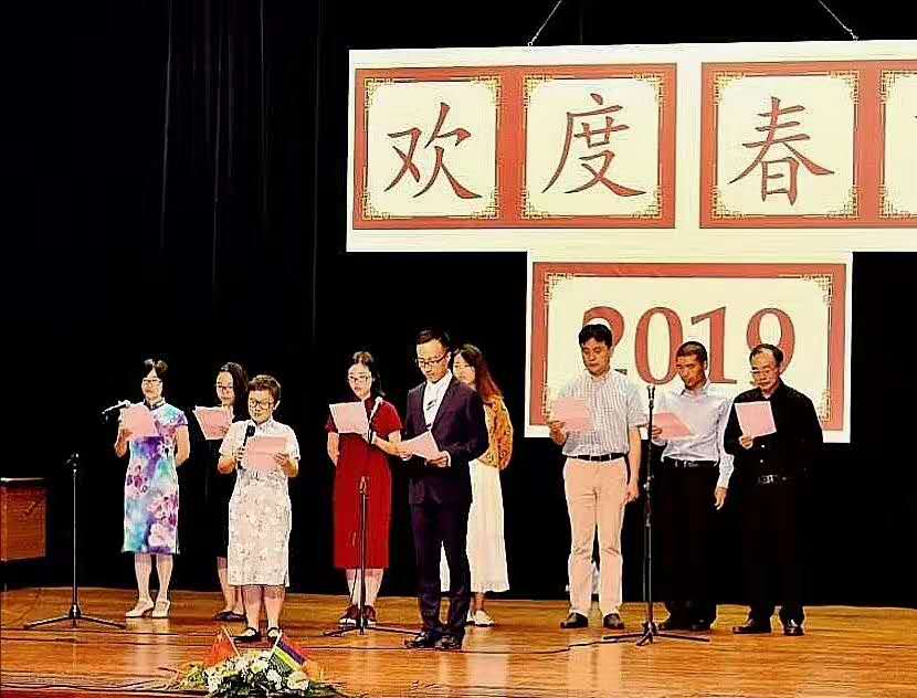 毛里求斯大学孔子学院春节晚会集体朗诵《梦乡》(前排左一)