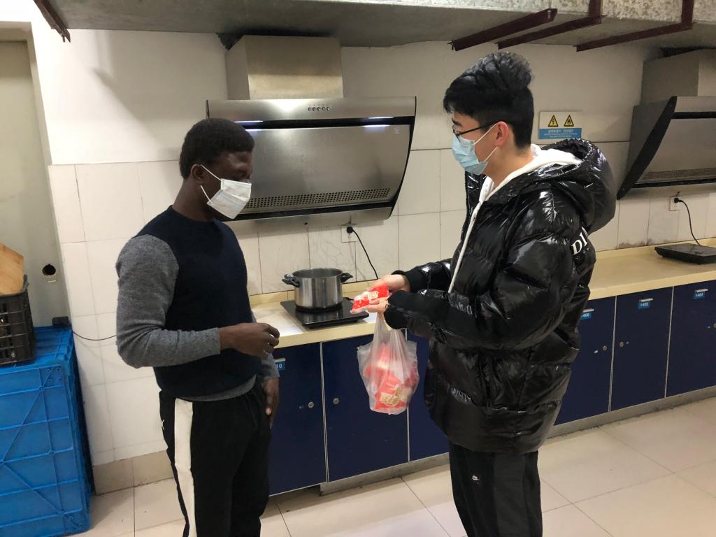 DAFIA CHABI SIMIN NAJIB是一名来自贝宁的留学生,假期他正好去了武汉大学见朋友。回校后,疫情爆发了,他就成了“重点关照对象”。“看了新闻,我当时很害怕,不知道该怎么办,幸好施润老师在边上安慰我不要慌张,给我耐心解释学校的隔离措施。”该生在学校防控办的协调下进行了居家隔离。“在隔离的日子里,老师们会定期给我送食材和生活用品。每天早上10点,沈嘉维老师都会准时来问候我的身体和体温情况,建议我多休息静养,适当做一些运动,增强免疫力。”