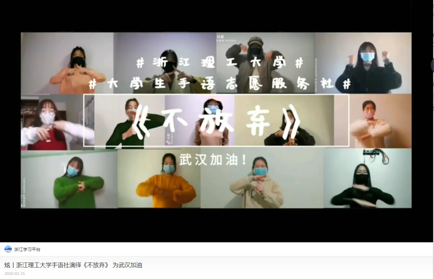 2月15日,【学习强国】报道我校手语社演绎手语舞《不放弃》为武汉加油。