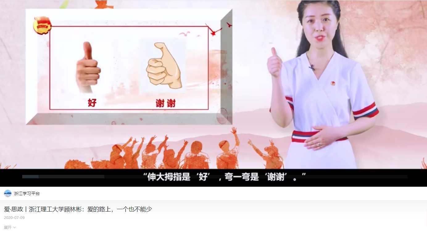 浙江理工大学党员教师顾林彬的思政微课从习近平总书记向一名聋哑女孩学习手语的新闻讲起。作为浙江理工大学手语社的指导老师,她常问大家为何加入手语社。其中一位同学的回答令她印象深刻。“多学一种语言,多做一些志愿服务,关爱残疾人,用真挚的心灵,善言善行,最美的青春,将残缺的身心用爱填满。”顾林彬说:“他们望着你的眼睛,就是我的担当和责任。”