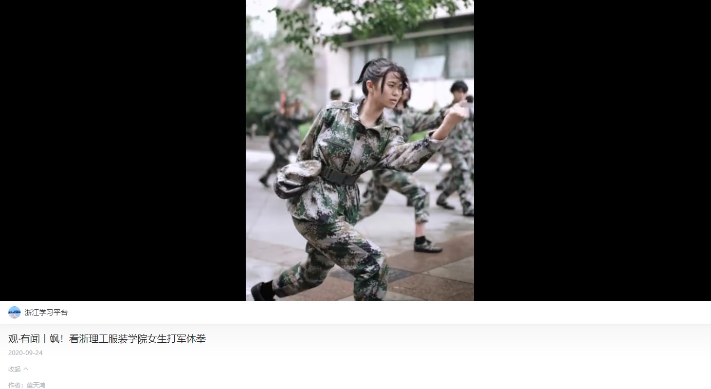 近日,浙江理工大学2020级新生军训正在如火如荼开展当中。作为军训项目之一,军体拳的练习深受学生们的喜爱。该校服装学院大一新生董天鸿拍下了自己学院女生练习军体拳的飒爽英姿。