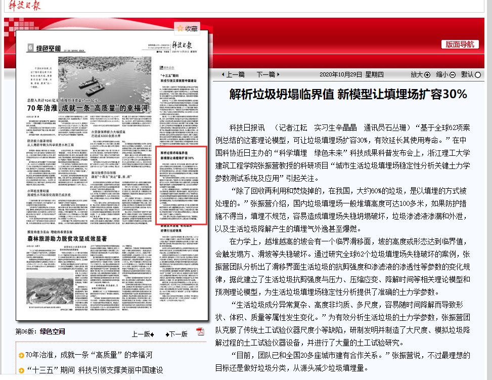 不久前,浙江理工大学建筑工程学院教授、博士生导师张振营的项目“城市生活垃圾填埋场稳定性分析关键土力学参数测试系统及应用”受邀参加中国科协新科技成果科普发布,25万人观看了这场“科技填埋,绿色未来”直播。张振营的这项成果为垃圾的科学填埋建立了一套有效的理论模型,大大增强了垃圾填埋场的规范性和安全性,并能让现有的垃圾填埋场扩容30%,有效延长了垃圾填埋场的使用寿命。