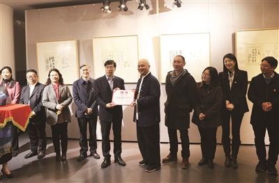 浙江理工大学党委书记吴锋民向杭州十竹斋艺术馆馆长魏立中颁发兼职教授聘任书。浙江理工大学纪委书记陈正奎向十竹斋艺术馆授牌“非遗文化创意工坊”铜牌。魏立中向浙江理工大学丝绸博物馆捐赠创作的水印版画《一团和气图》毛泽东《五律·看山》两幅作品。