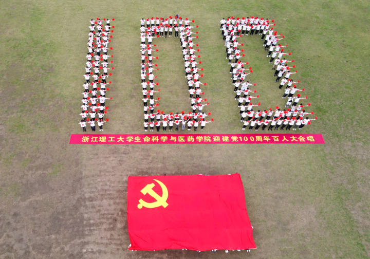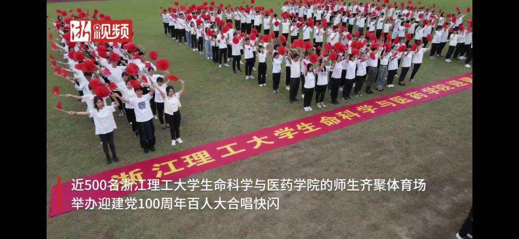 5月21日,近500名浙江理工大学生命科学与医药学院的党员师生和团员青年齐聚万人体育场,举办迎建党100周年百人大合唱快闪。在场师生高唱《没有共产党就没有新中国》和《唱支山歌给党听》,抒发对党的热爱和迎接建党百年华诞的喜悦之情。在近10米宽的巨幅党旗后面,大家手持党旗和红花,摆出“100”造型。