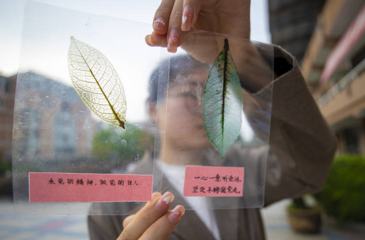 活动后,学生自发制作了精美的叶脉书签,上面写着各类祝福,送给参与活动的师生。据悉,浙江理工大学生命科学与医药学院将在近期陆续推出迎建党100周年系列庆祝活动,并在7月前逐步推向高潮。