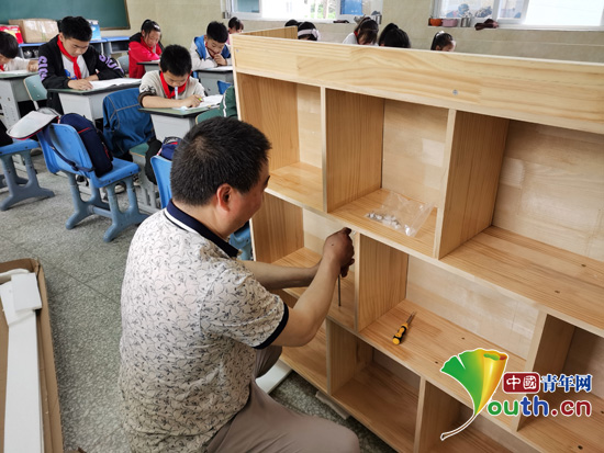 流黄水小学教师在安装书架。浙江理工大学研支团 供图