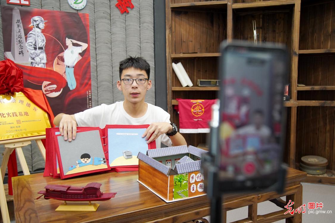2021年7月2日,浙江省湖州市南浔区和孚镇文化综合站内,浙江理工大学学生正通过直播的方式,介绍讲解当地红色文创产品。(张斌摄/光明图片)