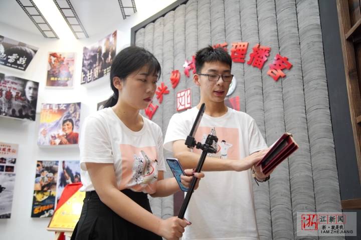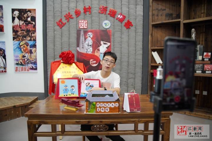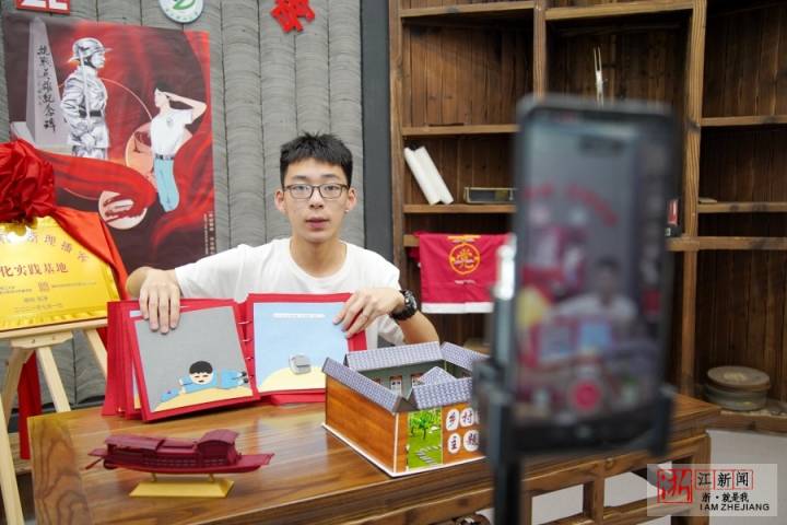 7月2日,湖州市南浔区和孚镇文化综合站内,浙江理工大学学生正通过直播的方式,介绍讲解当地红色文创产品。
