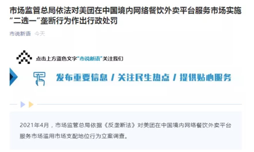 2021年4月,市场监管总局依据《中华人民共和国反垄断法》,对美团在中国境内网络餐饮外卖平台服务市场滥用市场支配地位行为立案调查。