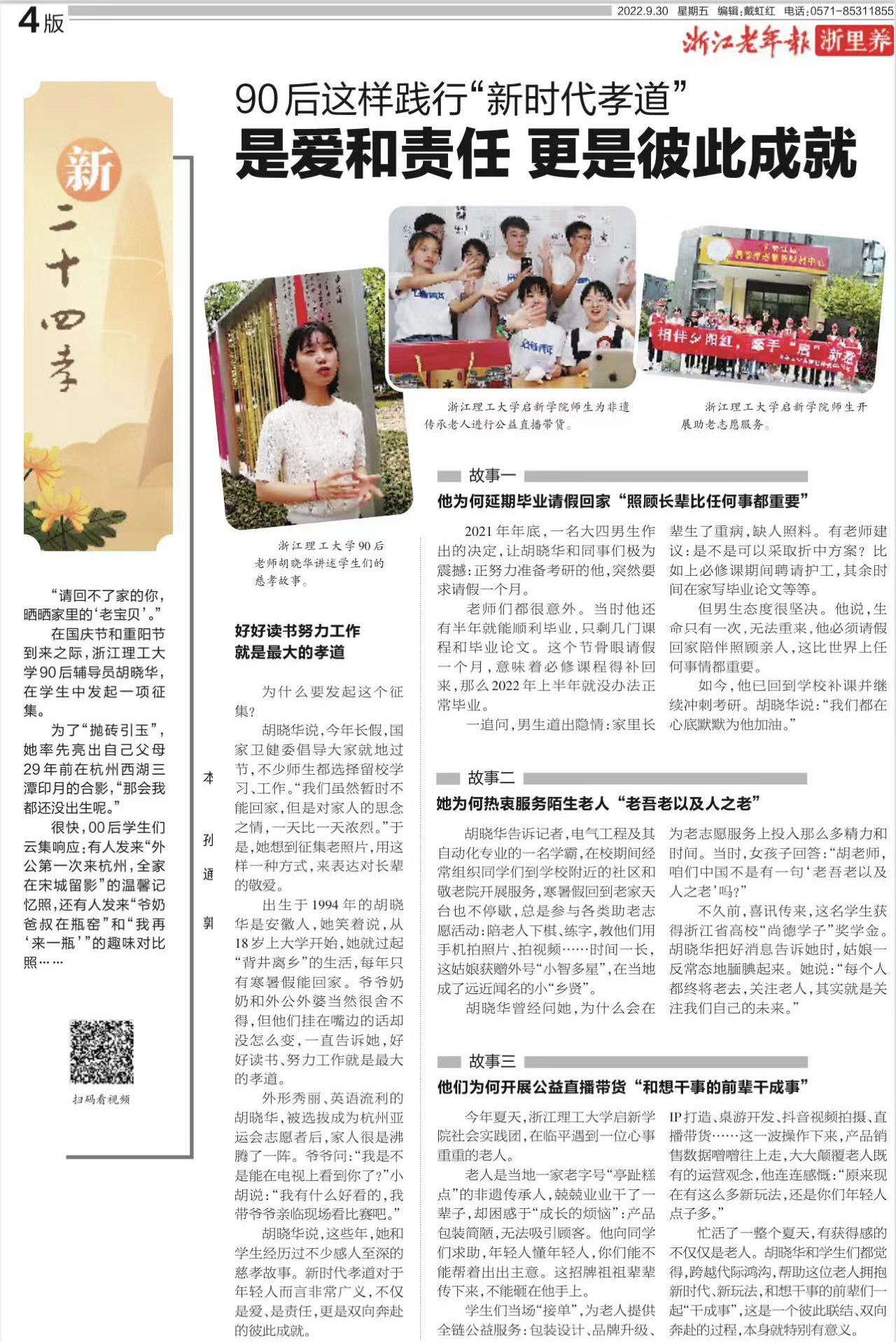 9月29日-30日,浙江新闻客户端、浙江老年报报道我校启新学院组织开展“喜迎二十大、青春暖重阳”活动践行新时代孝道。