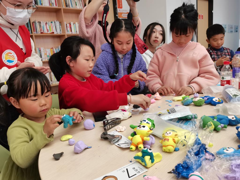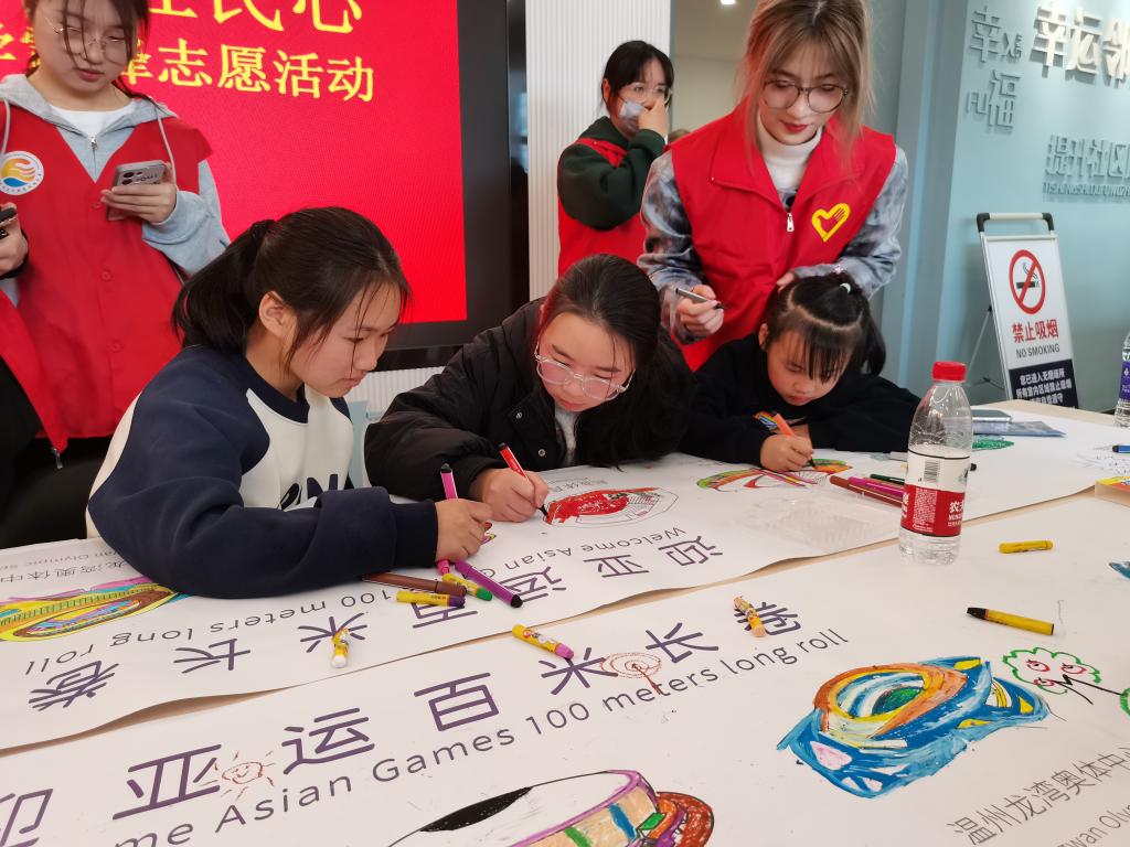 在临平区运旺社区党群服务中心,学院红色手绘社的志愿者们指导社区的小朋友们开展手绘“迎亚运”百米长卷活动。亚运场馆、吉祥物、运动项目、西湖十景……大家充分发挥想象力,一幅幅栩栩如生的手绘作品将百米长卷打造成了一件色彩斑斓的艺术品,描绘出了大家对杭州亚运的美好期待和美满祝福。此外,现场还开展了亚运会知识竞答,手工制作杭州亚运会吉祥物“琮琮、宸宸、莲莲”等泥塑作品,积极营造“人人参与亚运、人人服务亚运”的良好氛围。