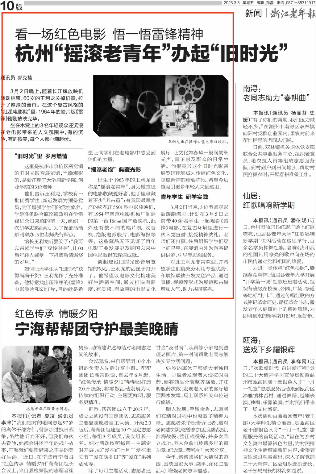 中国教育在线浙江站讯 (记者 占尘雪 通讯员 郭克楠)随着长江牌放映机转动结束,60岁的王利龙关掉机器,拉开了厚厚的窗帘。在这个复古风格的“红星电影院”里,1964年的胶片版《雷锋》刚刚放映完毕。坐在木凳上的一群年轻观众还沉浸在老电影带来的人文氛围中,有的沉吟,有的微笑,每个人都心潮起伏。
