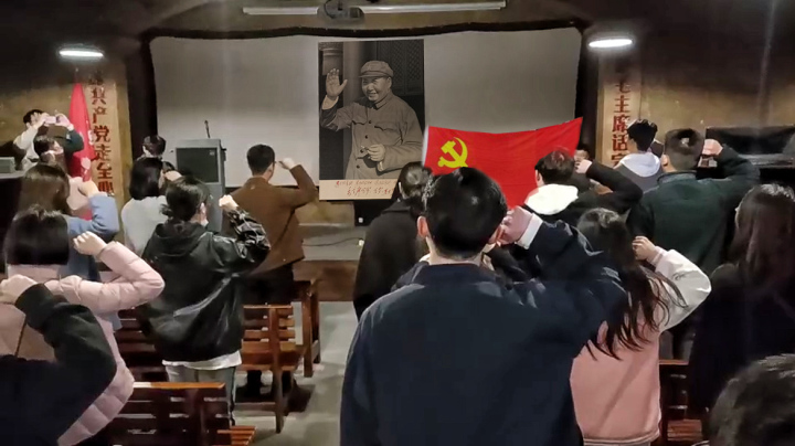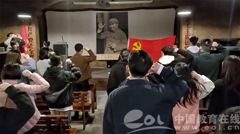 今天观影之后,学生们还在复古的环境里进行了一次入党宣誓,接受精神洗礼。当天下午开始,这些年轻人就穿上了志愿马甲,在展馆内外为游客提供讲解、引导等志愿服务。