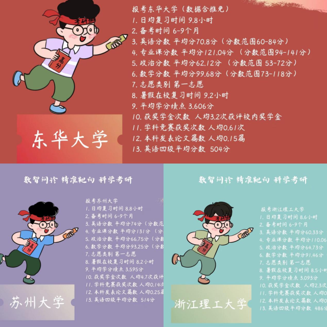 据悉,“数智问诊卡”是该学院通过软件测算和数据分析对过往四年的考研录取数据进行数字化分析,以东华大学、浙江理工大学等往年热门报考院校为类别制作的,分为不同颜色。而在不同的问诊卡里,学生可以结合自己大学三年的学业绩点、科研竞赛获奖情况等选择适合自身报考的院校,并将问诊卡里的各科上线录取平均分数、日均复习时间作为未来开展考研复习的重要参考因素。