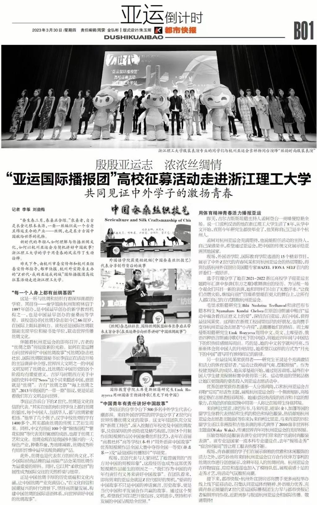 新时代的年轻人如何理解与传播丝绸文化,如何以杭州亚运会为契机讲好中国故事?3月29日下午,由杭州市委宣传部和杭州亚组委宣传部指导、都市快报、杭州外宣厨房主办的“Z世代·我的亚运我的城”国际播报团高校征募活动走进浙江理工大学,见证学子们用青春风采作下的生动诠释。