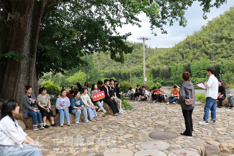 在余村的百年古银杏树下,学生党支部书记董选国和“化语先锋”宣讲团成员邓珊珊以两山理论为切入点,围绕红色科学家坚定理想信念的事迹为同学们讲授一堂对话式党课,同学们围坐一圈,在青山绿竹的环抱下,认真听讲。“学习新思想、谋求新发展,通过本次研学希望同学们能切实体悟新思想的内核内涵,提高党性修养、坚定理想信念、提升科学抱负,同时作为新成立不久的学院,更希望同学们在今后的专业学习中,能既调研也钻研,既立足自身发展也立足社会国家需要。”学生党支部书记董选国老师说。