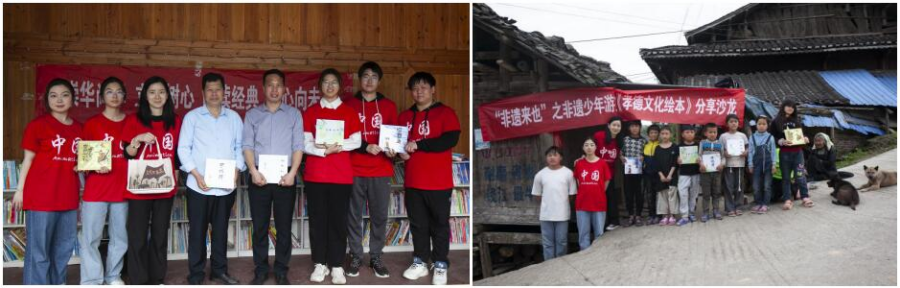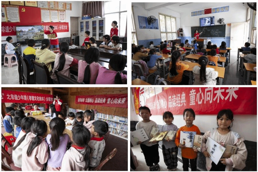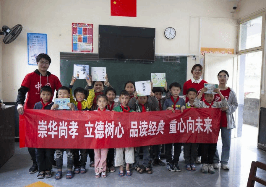 同时,学子们还深入山区小学,开展志愿服务活动,向孩子们传递红色孝德文化精神。孝德绘本分享活动在黎平口江中心小学、兰扒小学和天堂小学举行,为孩子们带来了一场意义非凡的孝德文化思政课堂。通过精心绘制、编排的《虞舜传说》、《谢安故事》、《曹娥故事》、《桌凳农具花》和《哑目连》等五本非遗孝德绘本,小老师们引导孩子们阅读、欣赏和理解绘本故事,拓宽他们的视野和知识面,提升他们的道德素养与品德。活动结束后,通过提供纪念品(学生团队设计的文创产品),希望能唤起孩子们对这些经典故事的回忆,持续传承红色文化的价值观。