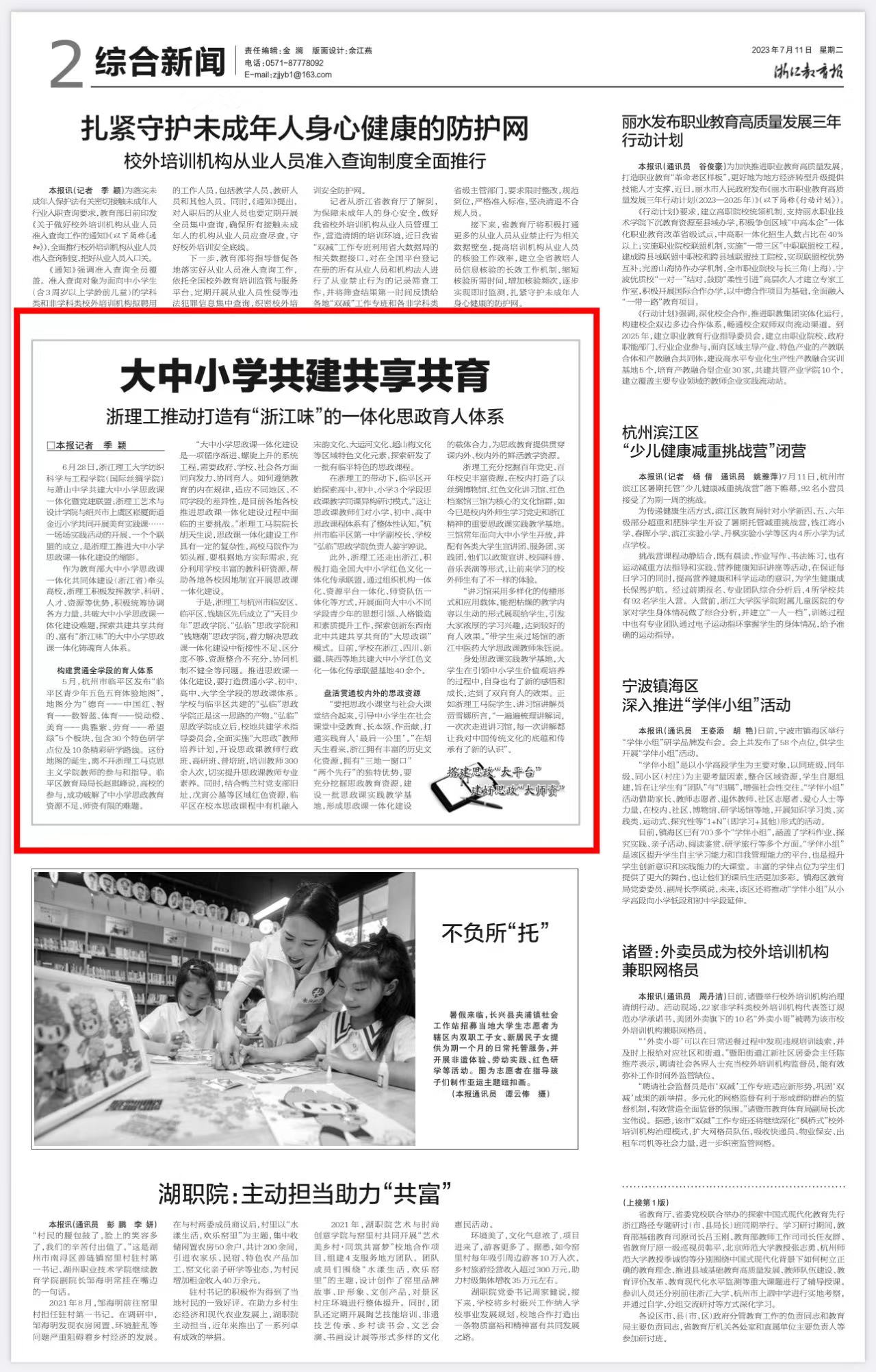 7月11日,《浙江教育报》(第2版)报道我校大中小学思政课一体化建设。