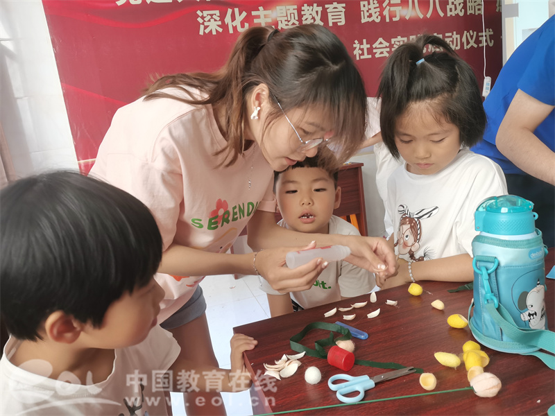 在金华武义县朱王村,实践团队员们讲授《丝绸文明起源》、展示考古溯源新科技产品-纺织品文物快速检测试剂盒、教授小朋友制作丝绸蚕茧工艺品,在活动过程中畅谈丝绸文化,让孩子们在动手的同时感受到蚕桑文化熏陶。