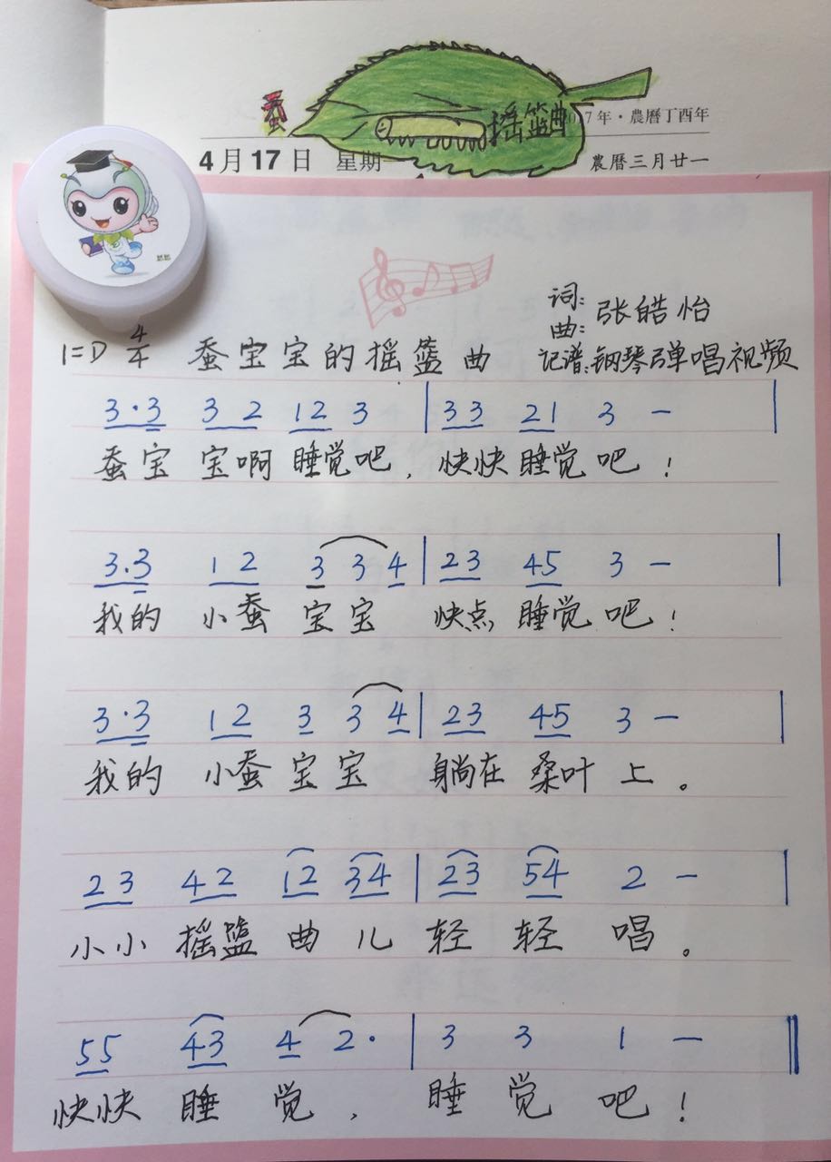 这张歌单是手写的,有曲谱和歌词;上面还手绘了漫画,有蚕宝宝和桑叶。词曲都是张皓怡小朋友自己创作的。