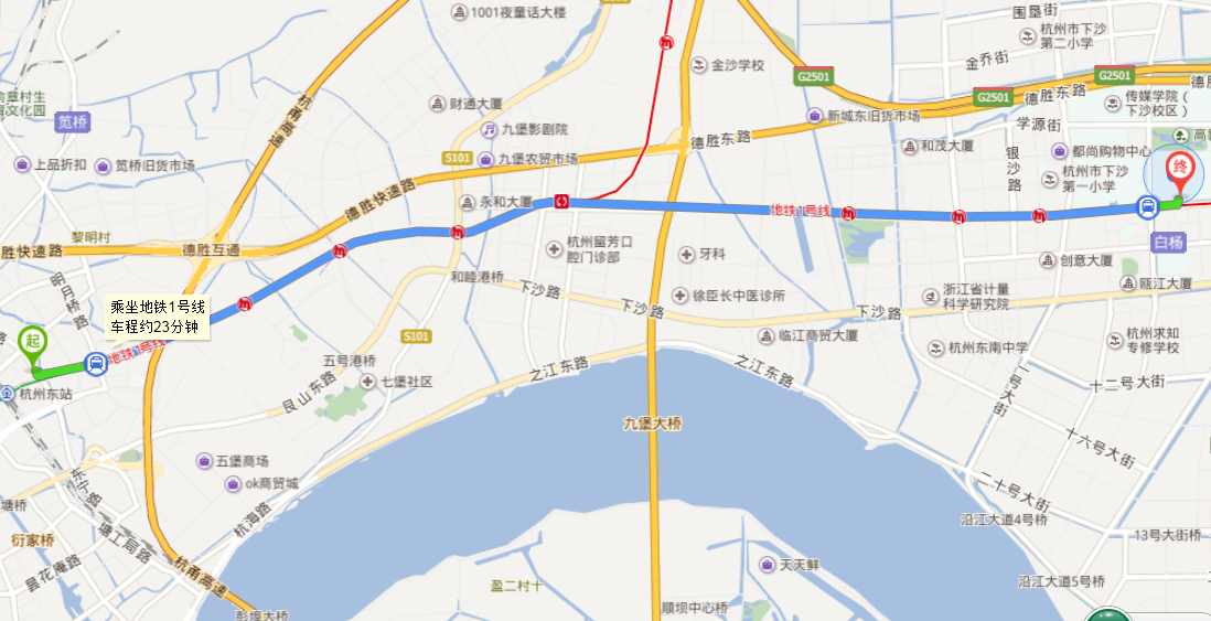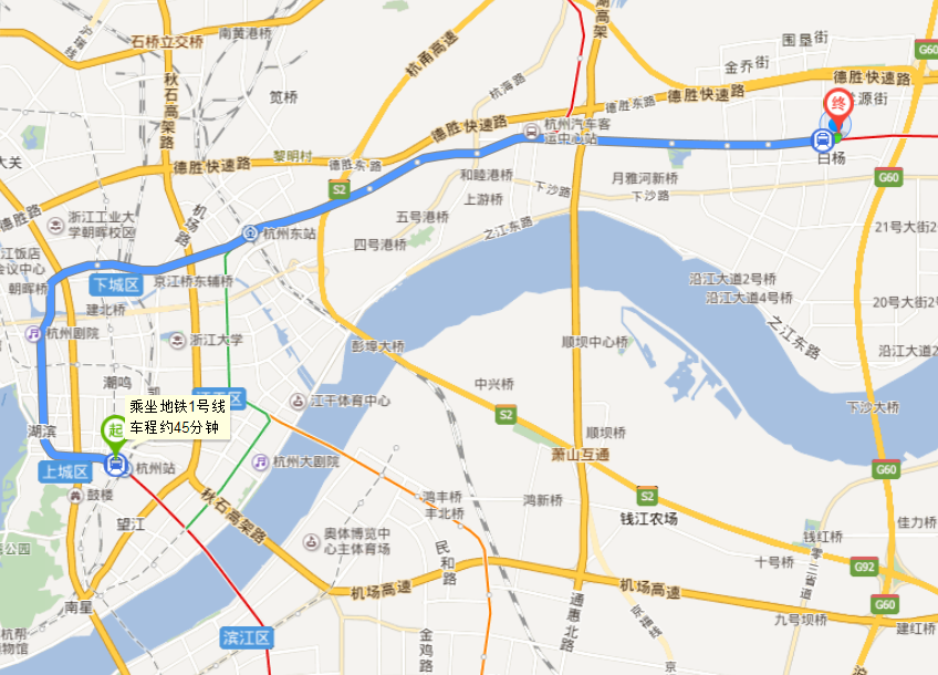 Ø 杭州客运中心(九堡汽车站):建议地铁1号线直达,客运中心(往下沙江滨方向)——文泽路站站(浙江理工大学出口出站),向东400米抵达浙江理工大学正门(南大门),票价:3元。出租车 :30元左右。