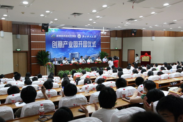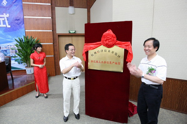 开园仪式上,我校艺术与设计学院院长李加林教授介绍了创意产业园的建设发展情况,张学宁和朱泽飞作为双方代表签署了创意产业园共建协议书,杭州经济技术开发区向园区赠送了扶持资金170万元,俞建国和裘松良共同为创意产业园揭了牌。
