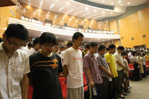启动仪式一开始,全场肃立,现场领导和师生一起向在地震中不幸遇难的同胞和在抗震救灾斗争中英勇献身的烈士默哀一分钟。