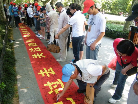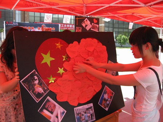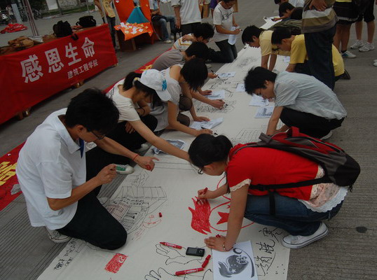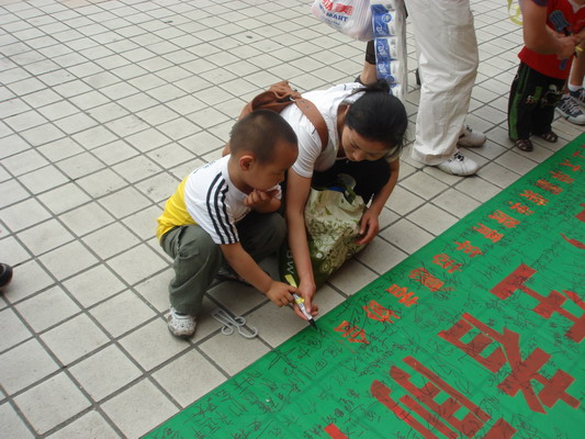 5月8日中午,外国语学院分团委在文化广场展出汶川地震的照片,唤起大家对一年前灾难的记忆,并组织了横幅签名送祝福活动,两位韩国留学生也用韩文工工整整地在横幅上写下了他们的祝福。“加油!我们在你身边!”“坚持,明天会更美好”“愿你们开始新的生活,永远幸福!”许多老师和同学还在一张张红色心形纸上写下对灾区的祝愿和鼓励。