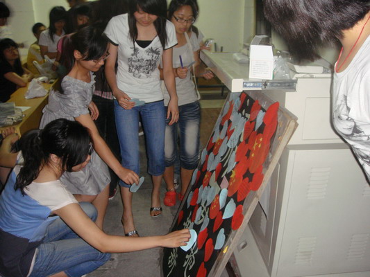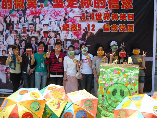 在5月8日世界微笑日,文传学院06传播学2班的10位女生在人来人往的校园主干道上,排成不同的队列,带上贴着笑脸的口罩并手持自己制作的贴满各种笑脸的雨伞,以行为艺术的方式,向路过的老师和同学传达以微笑温暖汶川的活动主旨。有不少好奇的老师和同学向她们了解了这次行为艺术,并参与了互动环节,用画笑脸的方式表达对汶川人民的祝福。