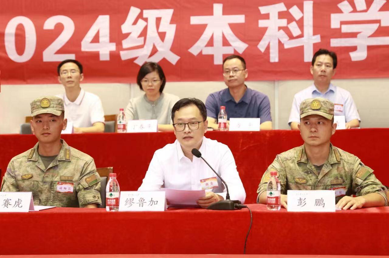 缪鲁加讲话。他代表学校向全体教官、带训教师和参训同学们表示了问候和祝愿。他向本次军训师生阐述了三个关键词:第一是刻苦与坚持,希望同学们不畏困难、刻苦训练,练就基本的军事素质与本领,展现出新时代青年的风采;第二是纪律与服从,希望同学们在军训的点滴中增强看齐意识,尊重教官、服从命令、听从指挥、严守纪律,练就过硬的军人作风;第三是安全与保障,同学们要及时与教官、带训教师沟通联系,保障自身安全。缪鲁加强调,参与军训工作的各单位全力配合做好教育管理和服务保障等方面的工作,确保高质量完成本次军训工作。
