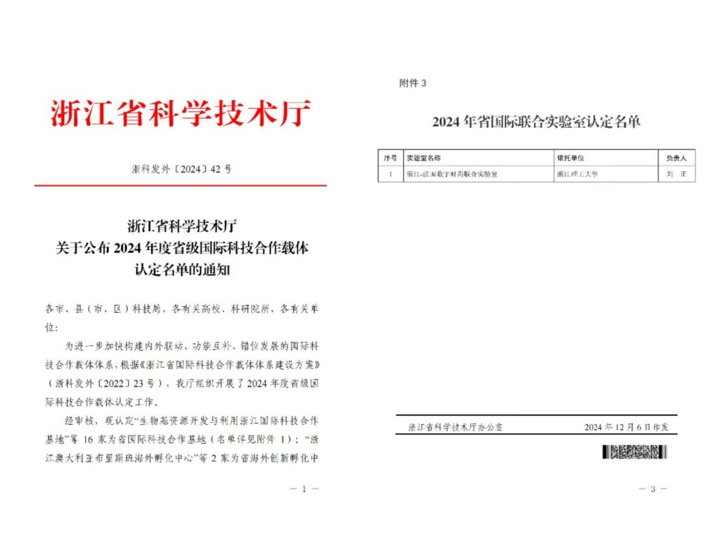 近日,浙江省科技厅公布了2024年度省级国际科技合作载体认定名单,我校申报的“浙江-法国数字时尚联合实验室”获认定。