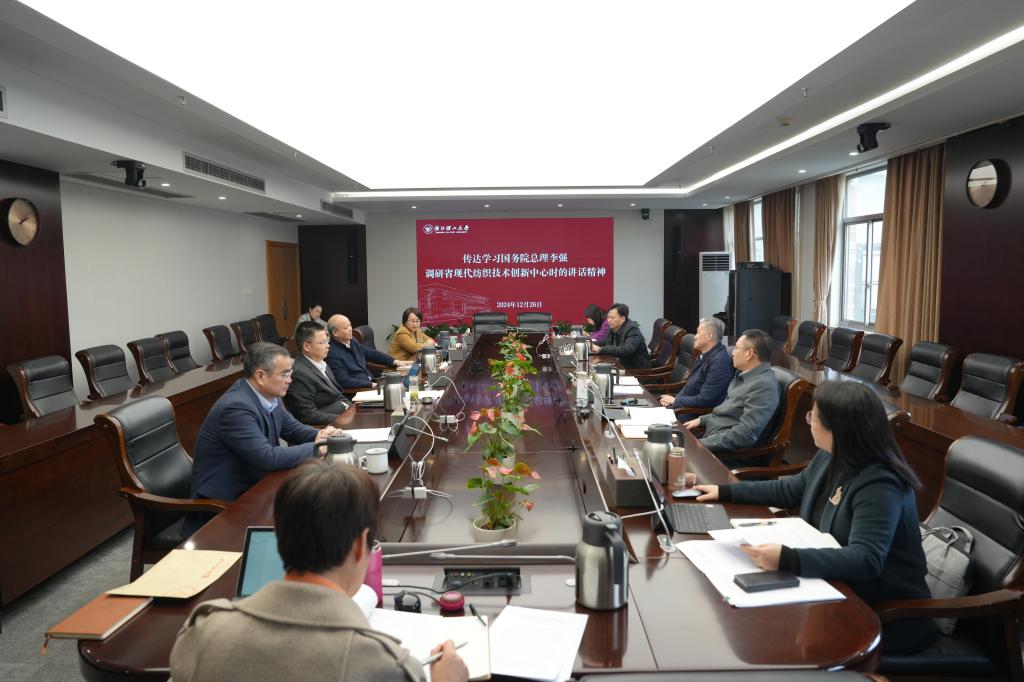 陈文兴传达国务院总理李强调研省现代纺织技术创新中心时的讲话精神。他指出,李强总理充分肯定学校在人才培养、纺织产业、材料创新等方面的工作,并希望学校通过数字、绿色等先进技术赋能,推进新技术新工艺新场景大规模应用,让传统纺织产业在改造升级中焕发活力、蝶变发展。他强调,要认真学习李强总理的讲话精神,充分发挥学校纺织学科人才集聚的优势,着力打造一支“编制在高校、工作在中心、贡献在企业”的人才队伍,实现人才链、教育链、产业链、创新链无缝衔接和深度融合。要进一步建好创新平台,大力推进技术攻关,运用好推广好“企业出题+政府助题+中心领题+师生答题+车间验题”模式,在现代纺织产业转型升级中发挥更大作用。