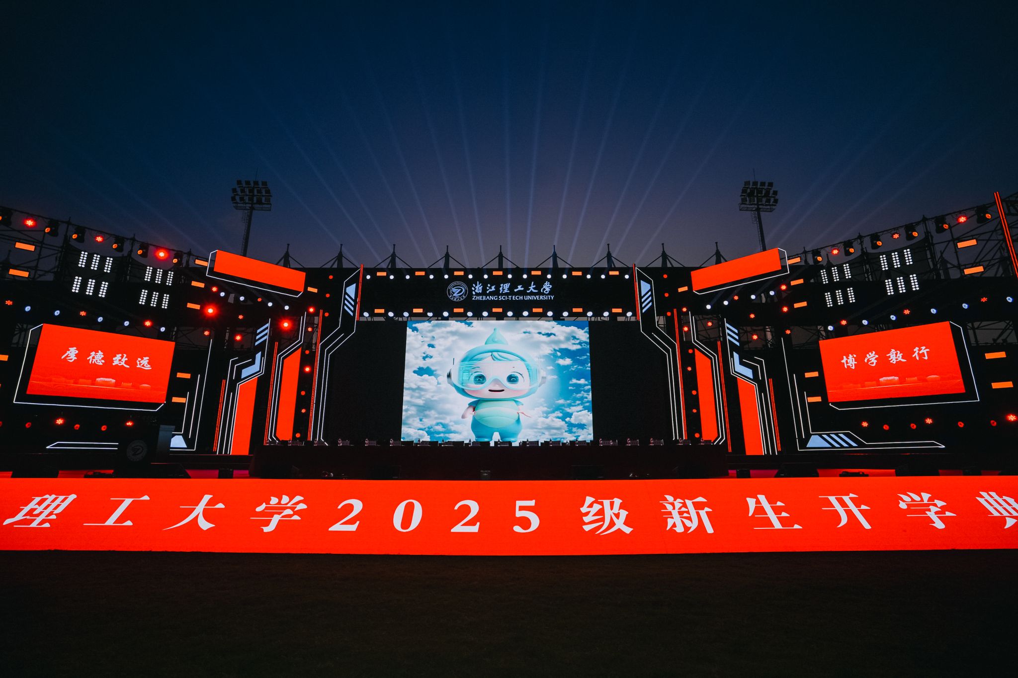 9月15日晚,浙江理工大学2025级新生开学典礼在下沙校区万人体育场举行。校党政领导班子成员赵全军、陈文兴、姚菊明、姚珺、陈正奎、周必彧、郭玉海、缪鲁加、陈爱喜、任宁出席典礼。典礼由校党委副书记缪鲁加主持。