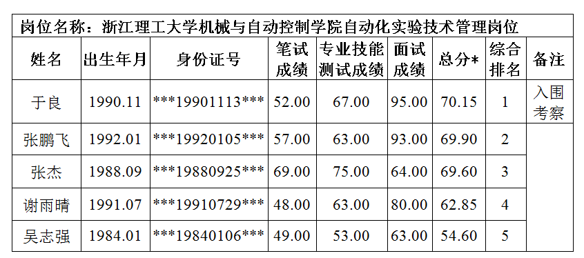 根据浙江省人力资源和社会保障厅统一事业单位公开招聘公告,经浙江理工大学机械与自动控制学院2019年1月11日的专业技能测试与面试,现将结果公布如下: