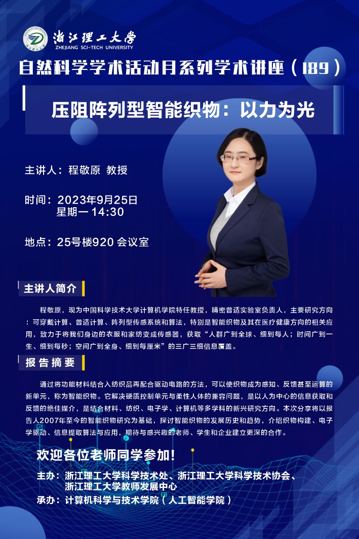 通过将功能材料结合入纺织品再配合驱动电路的方法,可以使织物成为感知、反馈甚至运算的新单元,称为智能织物。它解决硬质控制单元与柔性人体的兼容问题,是以人为中心的信息获取和反馈的绝佳媒介,是结合材料、纺织、电子学、计算机等多学科的新兴研究方向。本次分享将以报告人2007年至今的智能织物研究为基础,探讨智能织物的发展历史和趋势,介绍织物构建、电子学驱动、信息提取算法与应用,期待与感兴趣的老师、学生和企业建立更深的合作。