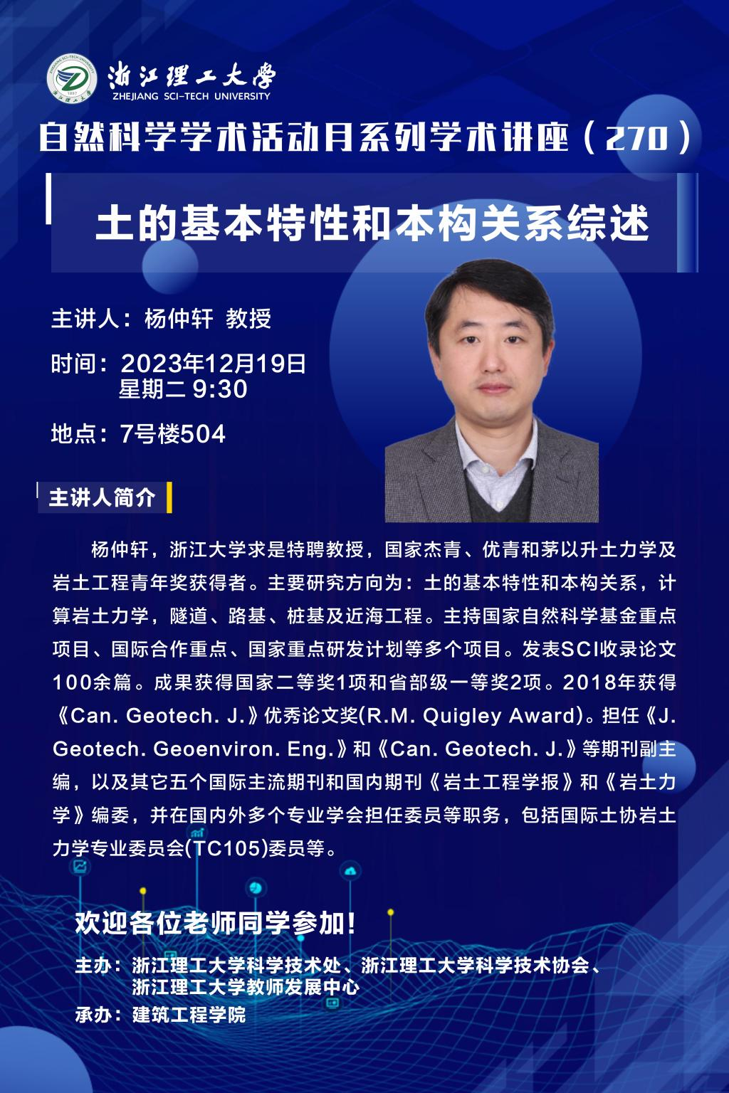杨仲轩,浙江大学求是特聘教授,国家杰青、优青和茅以升土力学及岩土工程青年奖获得者。主要研究方向为:土的基本特性和本构关系,计算岩土力学,隧道、路基、桩基及近海工程。主持国家自然科学基金重点项目、国际合作重点、国家重点研发计划等多个项目。发表SCI收录论文100余篇。成果获得国家二等奖1项和省部级一等奖2项。2018年获得《Can. Geotech. J.》优秀论文奖(R.M. Quigley Award)。担任《J. Geotech. Geoenviron. Eng.》和《Can. Geotech. J.》等期刊副主编,以及其它五个国际主流期刊和国内期刊《岩土工程学报》和《岩土力学》编委,并在国内外多个专业学会担任委员等职务,包括国际土协岩土力学专业委员会(TC105)委员等。