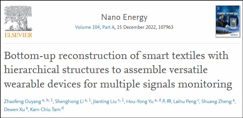近日,纺织科学与工程学院(国际丝绸学院)余厚咏教授课题组在国际著名期刊Nano Energy(IF=19.069)发表了题为“Bottom-up reconstruction of smart textiles with hierarchical structures to assemble versatile wearable devices for multiple signals monitoring”的研究论文(DOI: 10.1016/j.nanoen.2022.107963)。材料科学与工程学院2019级研究生欧阳兆锋(曾获校长特别奖资助)、纺织科学与工程学院(国际丝绸学院)2022级研究生李升鸿、机械控制学院2020级研究生刘建廷为共同第一作者,浙江理工大学纺织科学与工程学院(国际丝绸学院)余厚咏教授为唯一通讯作者,我校为第一完成单位。