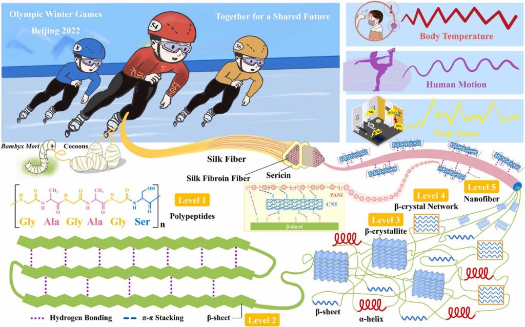 智能纺织品是与各种电子部件(传感器、显示器、电池、蜂鸣器、灯和电路)集成的一体化功能性织物,因其在医疗监测、人机交互和主动预警方面的巨大潜力吸引了极大关注。作为智能可穿戴系统,智能纺织品必须满足服装轻质保暖、柔韧透气的基本特征,除此之外,在实际应用的复杂工况下(各种变形、摩擦和水下环境),智能纺织品也有望实现对体温和人体全方位运动的实时监测。通常,制备智能纺织品是通过在绝缘纱线上负载功能单元(金属纳米粒子、导电聚合物和碳材料),赋予其高导电性,并通过机织、针织或缝纫方法将其融入到织物基底上。作为天然生物质材料的代表,蚕丝由于其质量轻、机械性能优异、耐用性高、生物相容性好和易于大规模生产等卓越特性,吸引了研究人员的目光;但其固有的绝缘特性极大地限制了其在智能纺织品和可穿戴传感器中的进一步发展。为了获得导电蚕丝,现已开发大量实用方法,包括3D打印、湿法纺丝、干法纺丝及导电纳米材料喂蚕吐丝等。但最终得到的复合纱线存在导电成分团聚,不能形成三维连续导电网络,这大大限制了其在智能纺织品中的进一步应用。对丝绸织物进行直接碳化是构建智能纺织品的另一种可行策略,但高温处理极大破坏了天然丝绸原有的机械强度和韧性。因此,开发集结构、机械、电气和加工优势为一体的蚕丝基单一传感系统仍存在很大的挑战。