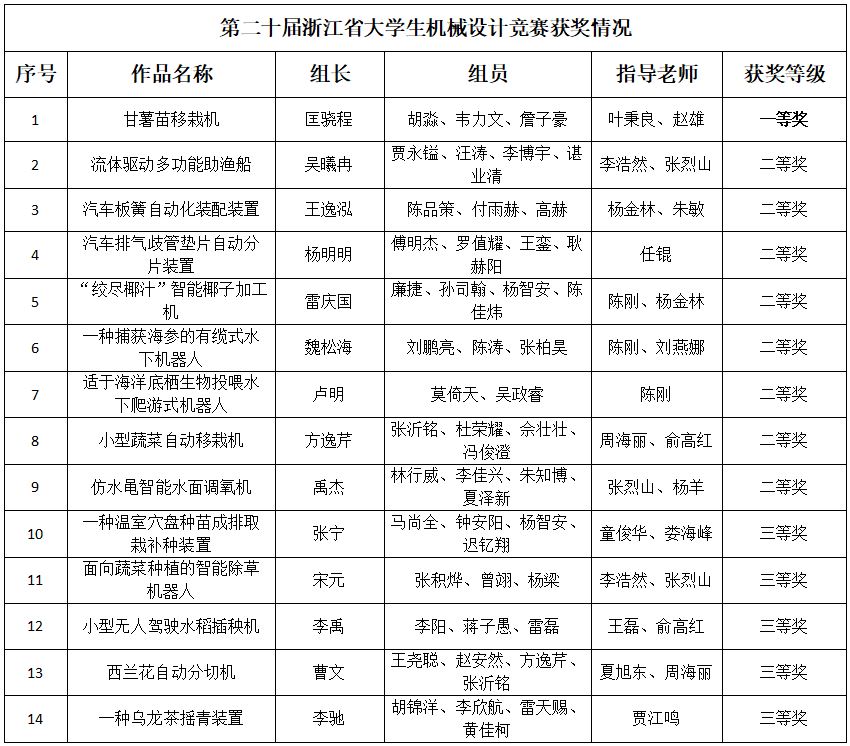 此次竞赛的主题为“创新未来制造、携手助农共富”,旨在培养新时代大学生的创新设计、综合设计能力和团队合作精神,提高全省高校大学生的机械设计水平,为浙江省高端装备制造业输送更多的人才。为此机械工程学院共选拔了24支队伍参加省赛初赛,最终16支队伍入围决赛参加现场评审。经成果展示和答辩,最终,共有14项作品获奖。