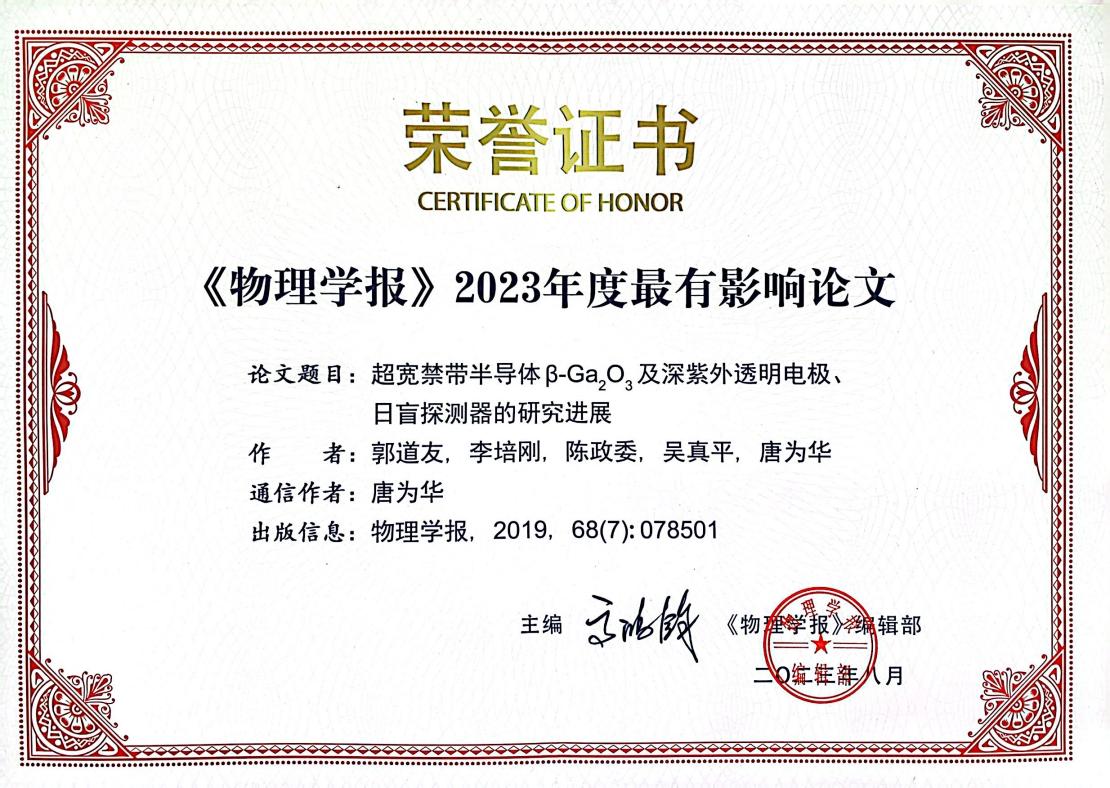 8月18日,中国物理学会秋季学术会议在宁夏召开。会上,浙江理工大学为第一单位、理学院物理学系郭道友特聘教授为第一作者发表的综述文章《超宽禁带半导体β-Ga2O3及深紫外透明电极、日盲探测器的研究进展》[物理学报, 2019, 68(7): 078501.doi: 10.7498/aps.68.20181845] 荣获“《物理学报》2023年度最有影响论文奖”。