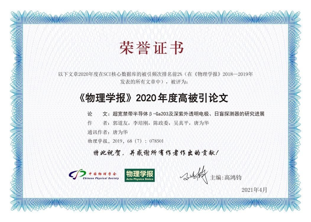 此前,该论文2020年度在SCI核心数据库的被引频次排名前2%(在《物理学报》2018-2019年发表的所有文章中),被评为“《物理学报》2020年度高被引论文”。