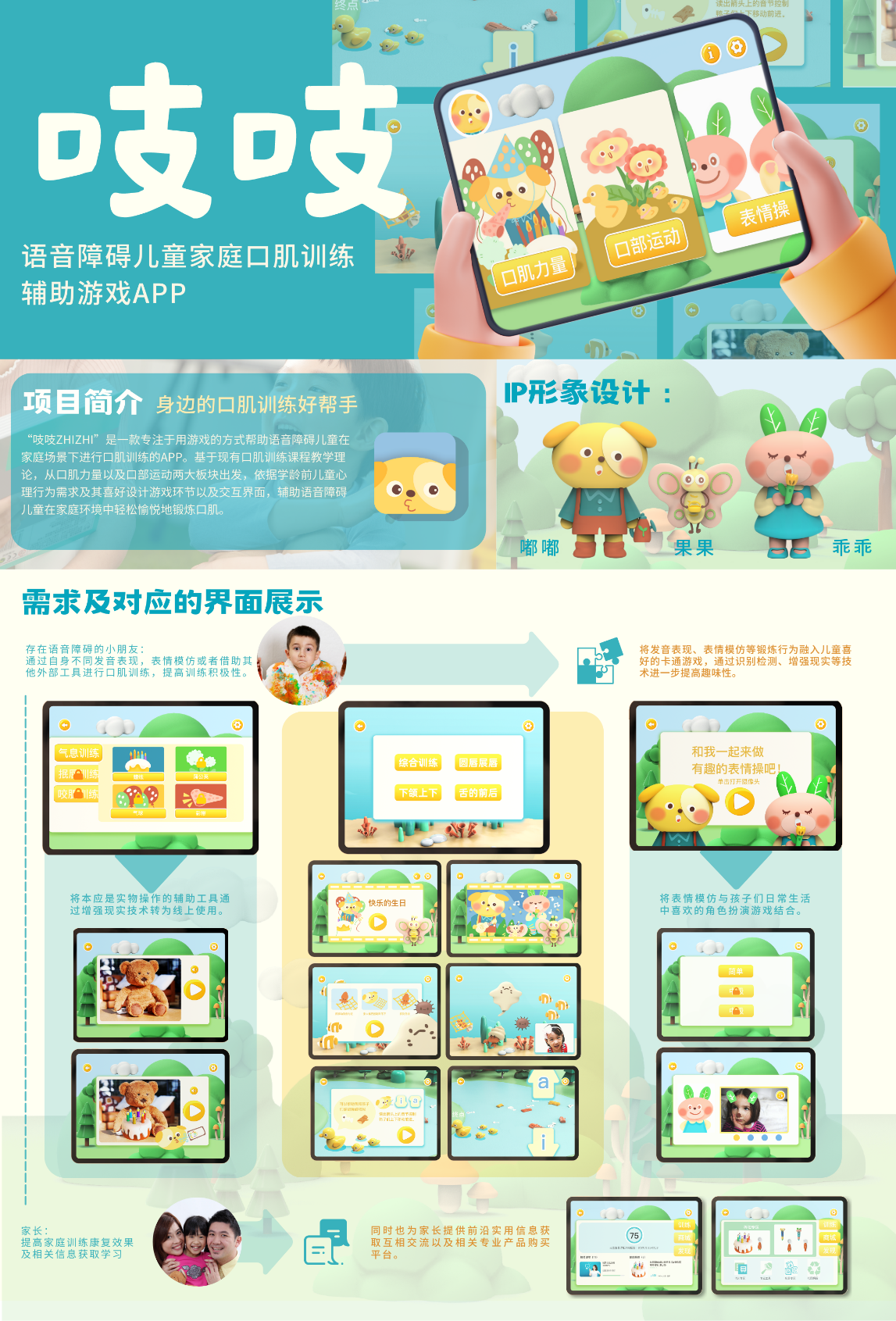 设计简介:“吱吱”是一款专注于用游戏的方式帮助语音障碍儿童在家庭场景下进行口肌训练的APP。基于现有口肌训练课程教学理论,从口肌力量与口部运动两大板块出发,依据学龄前儿童心理行为需求及其喜好设计游戏环节以及交互界面,辅助语音障碍儿童在家庭环境中轻松愉悦地锻炼口肌。