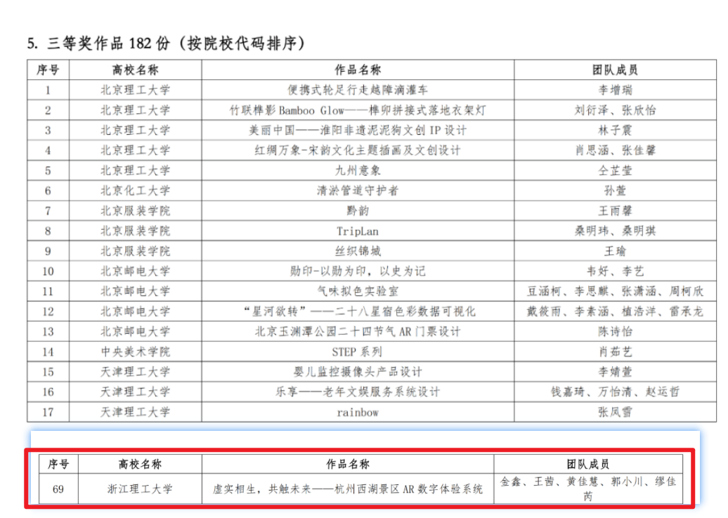 11月26日,由教育部学位管理与研究生教育司指导、中国学位与研究生教育学会和中国科协青少年科技中心主办的首届中国研究生“美丽中国”创新设计大赛在杭州建德落下帷幕。首届中国研究生“美丽中国”创新设计大赛于2023年6月12日正式启动,设置有环境空间设计、服装与服饰设计、工业产品设计、媒体传达设计、建德主题设计五个不同赛道。大赛赛程历时6个多月,来自全国304所高校和科研院所的5943支团队、15559名研究生踊跃参与,参赛规模居中国研究生创新实践系列大赛16项主题赛事前三。此次大赛共有284份作品进入等级奖名单,我院麻欣瑶、胡广老师指导的研究生项目《虚实相生,共触未来一一杭州西湖景区 AR 数字体验系统》荣获全国三等奖,这也是建筑工程学院“红筑未来”AR工作室的成果。